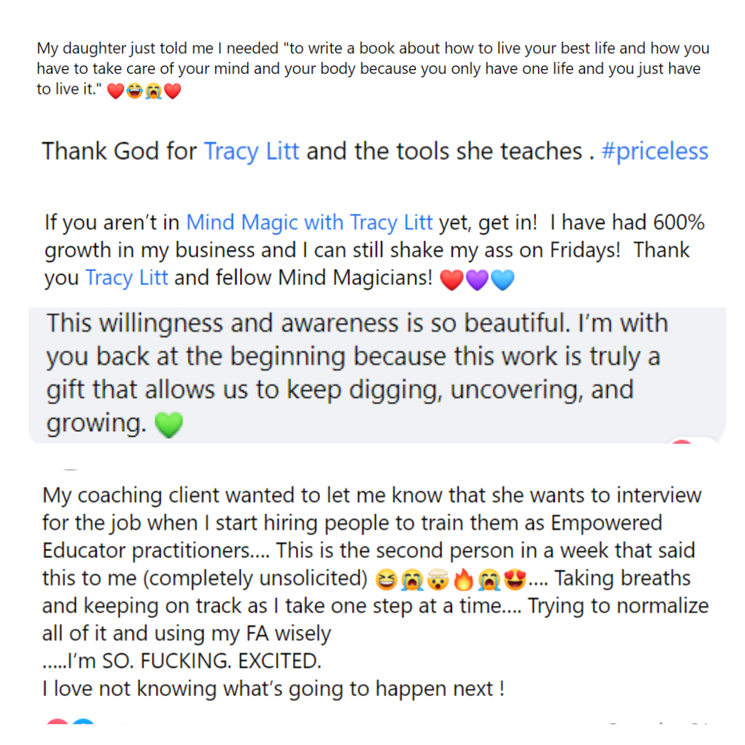 - Rewire the thoughts that quietly sabotage your success using a proven framework taught live, with real scenarios you’re currently navigating.